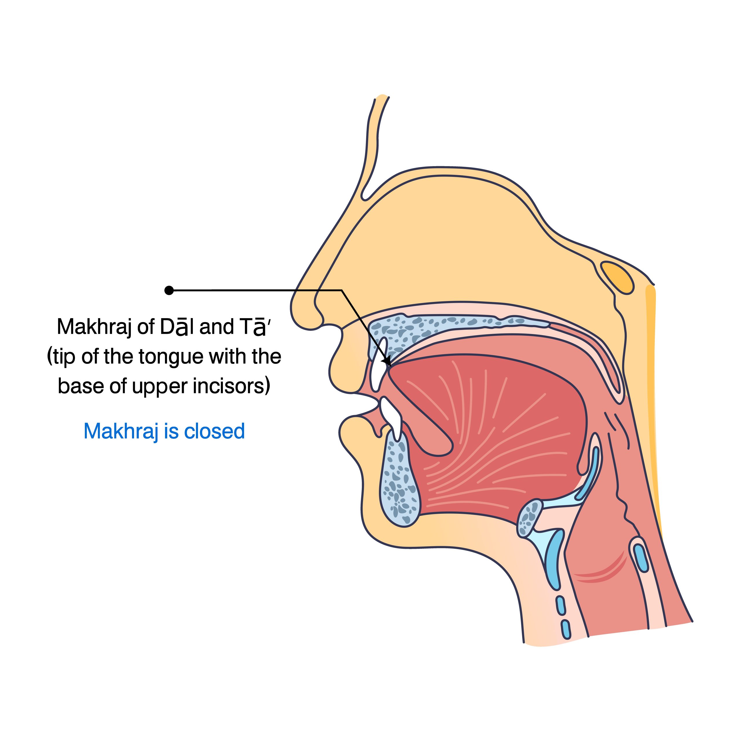 The image shows the tongue’s tip closing tightly against the roots of the upper incisors, not allowing flow of sound, so the sound is cut abruptly. This is what defines the characteristic of 'shiddah'(Intensity).