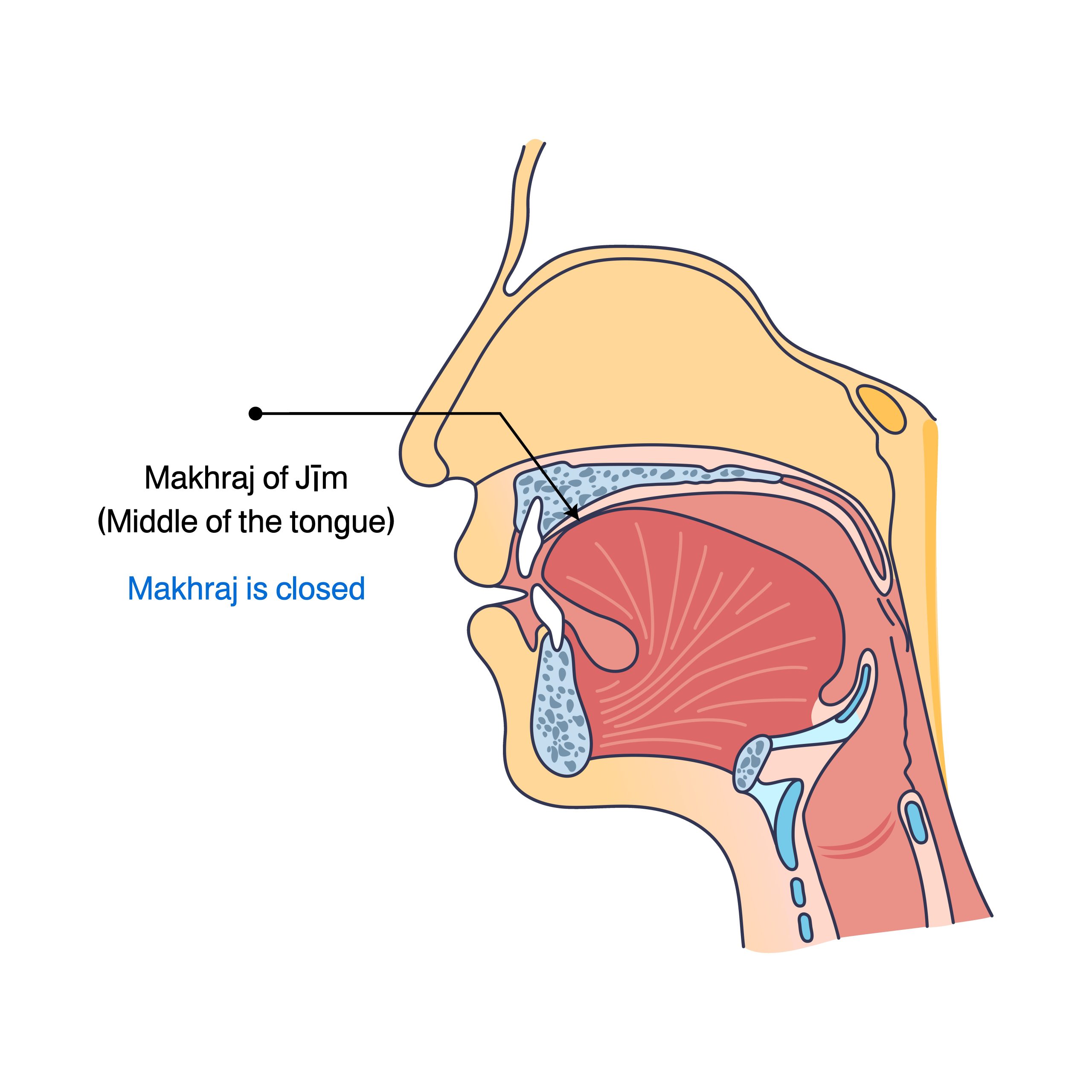 The letter Jīm is articulated from the middle of the tongue along with the corresponding part of the upper palate. It shares its articulation point with the letters Shīn (ش) and non-elongated Yāʾ (ي), as shown in the image.