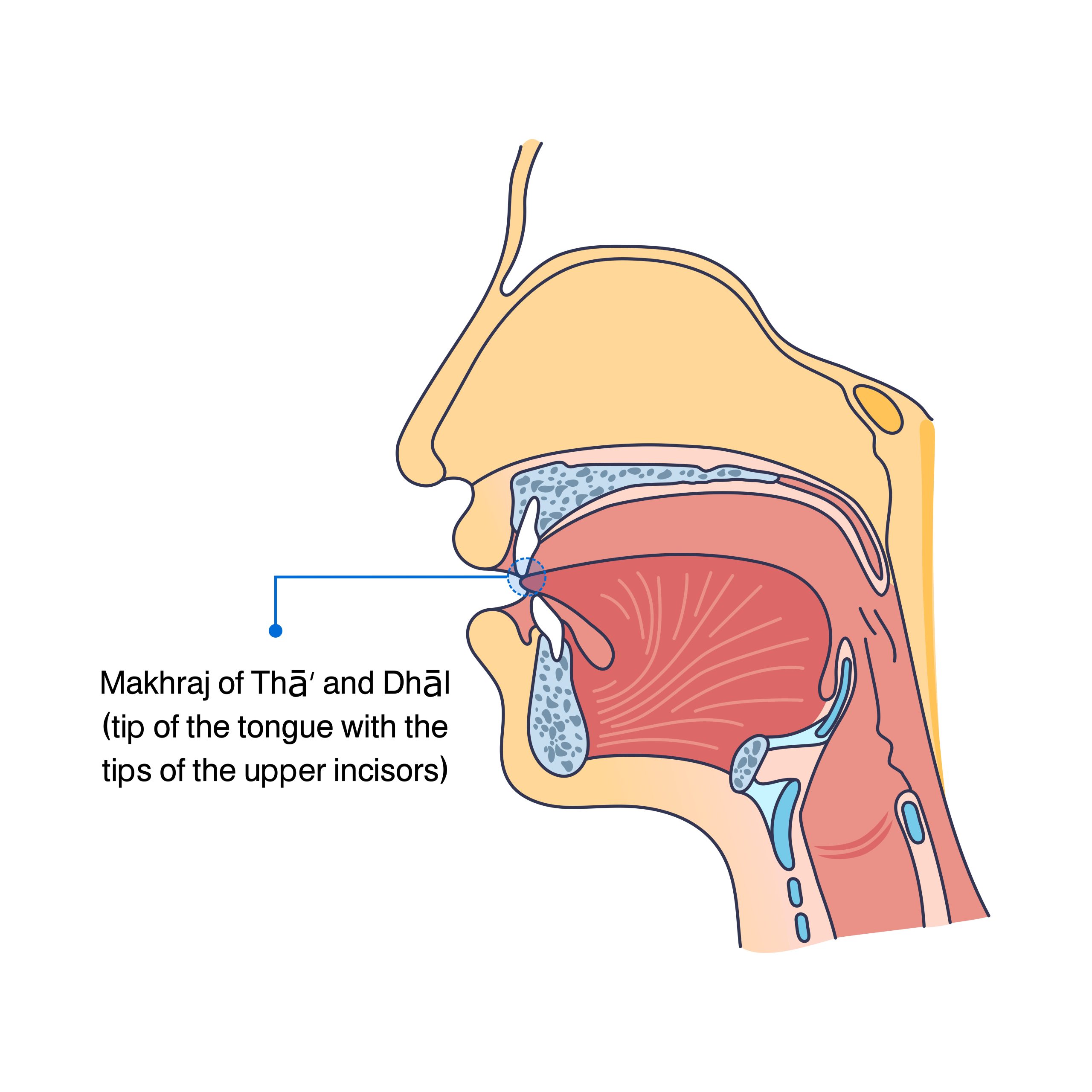 The letter Dhāl is articulated from the tip of the tongue touching the tips of the upper incisors. It shares its articulation point with the letters Ẓā’ and Thā’. The reader must slightly advance the tongue from between the teeth for proper pronunciation, as shown in the image.