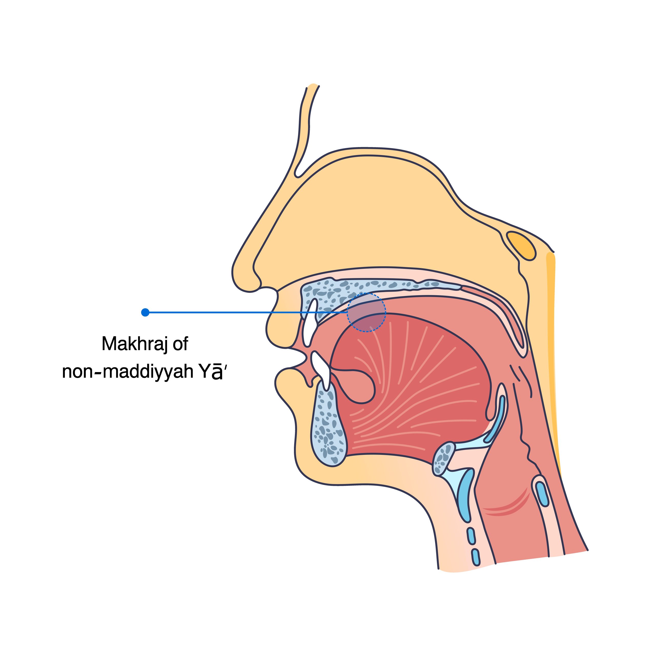 The non-elongated Yā’ is articulated from the middle of the tongue along with the corresponding part of the upper palate. It shares its articulation point with the letters Jīm (ج) and Shīn (ش), as shown in the image.