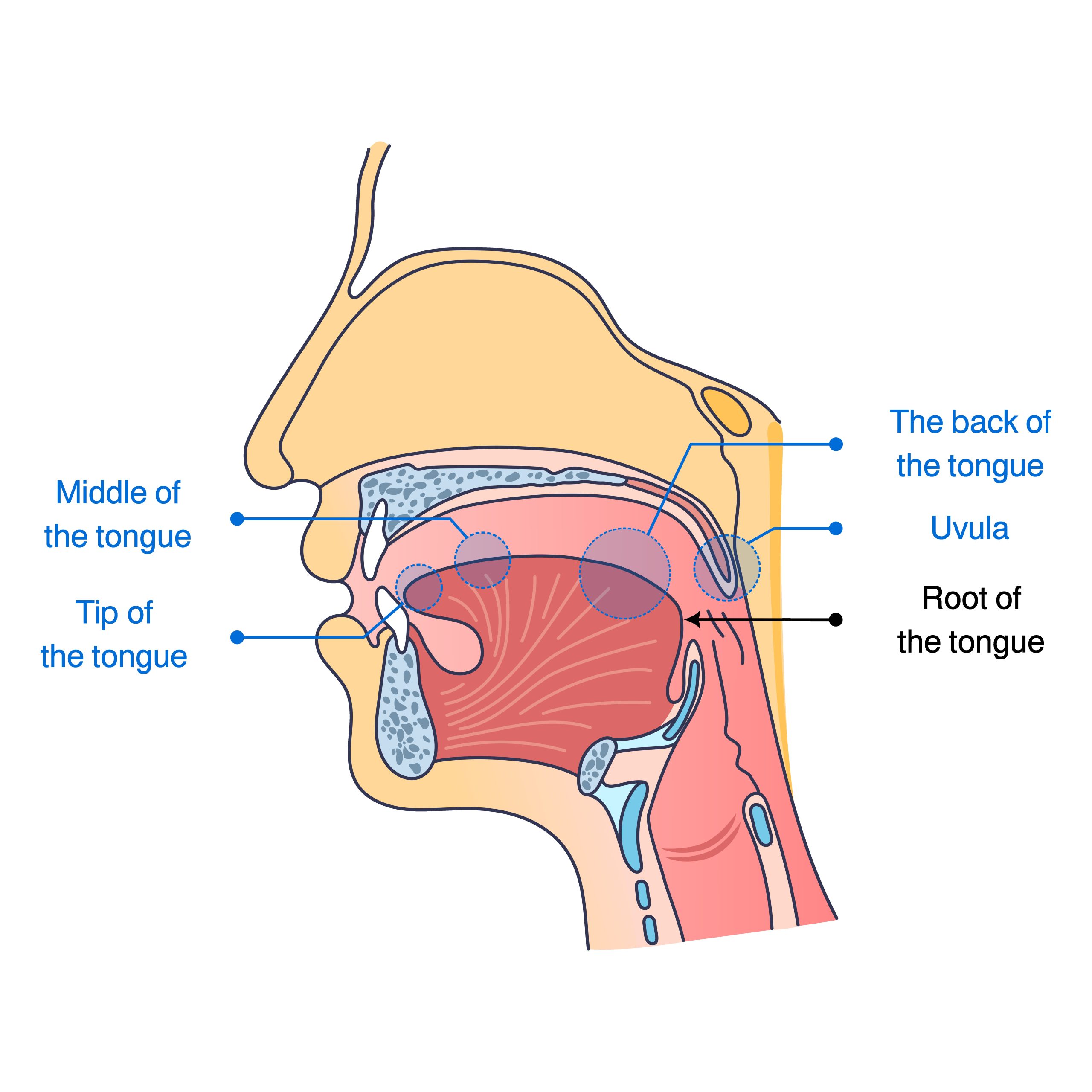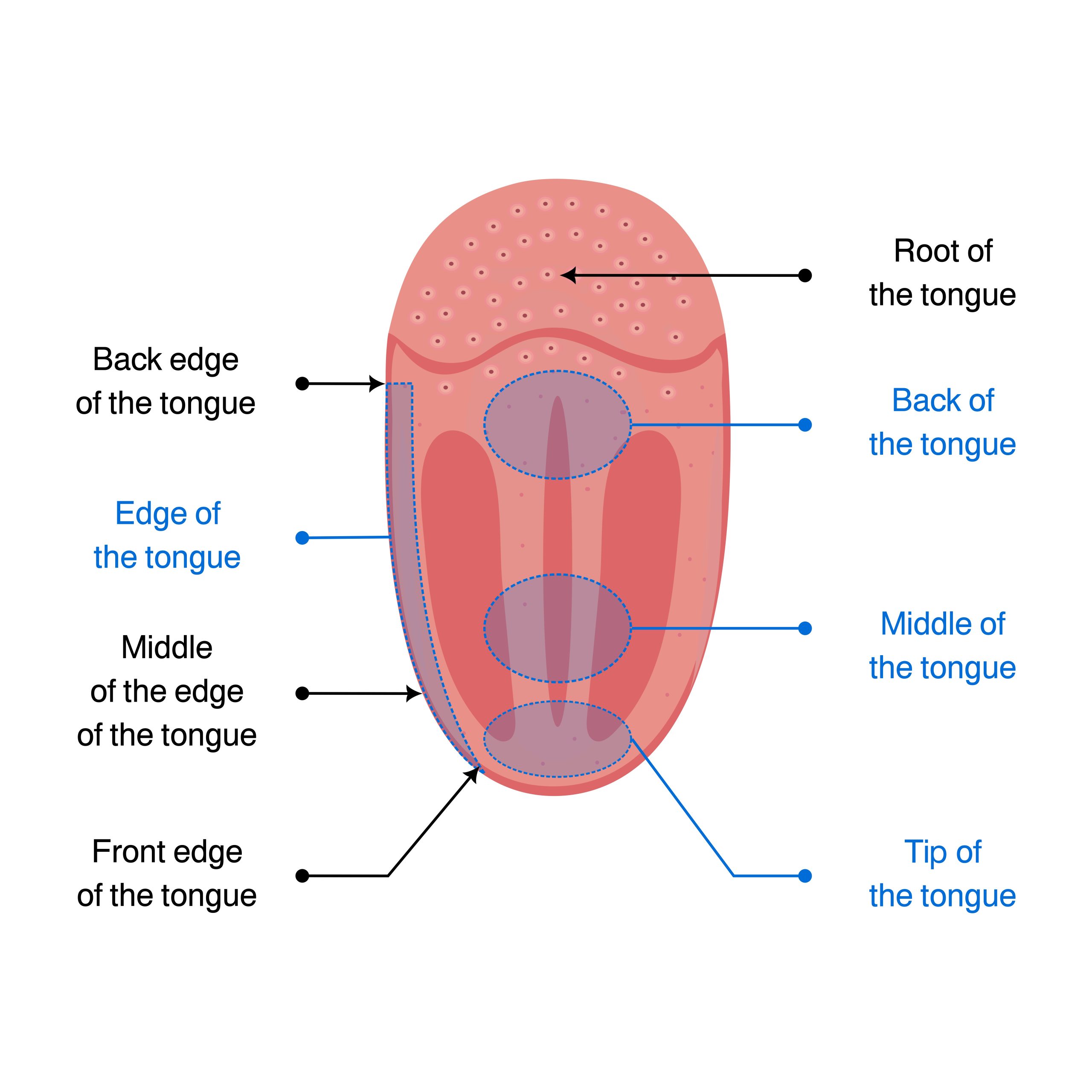 The tongue is a general articulation point from which includes ten specific articulation points. It includes eighteen letters. Below is an explanation of the sections of the tongue through text and attached diagrams.