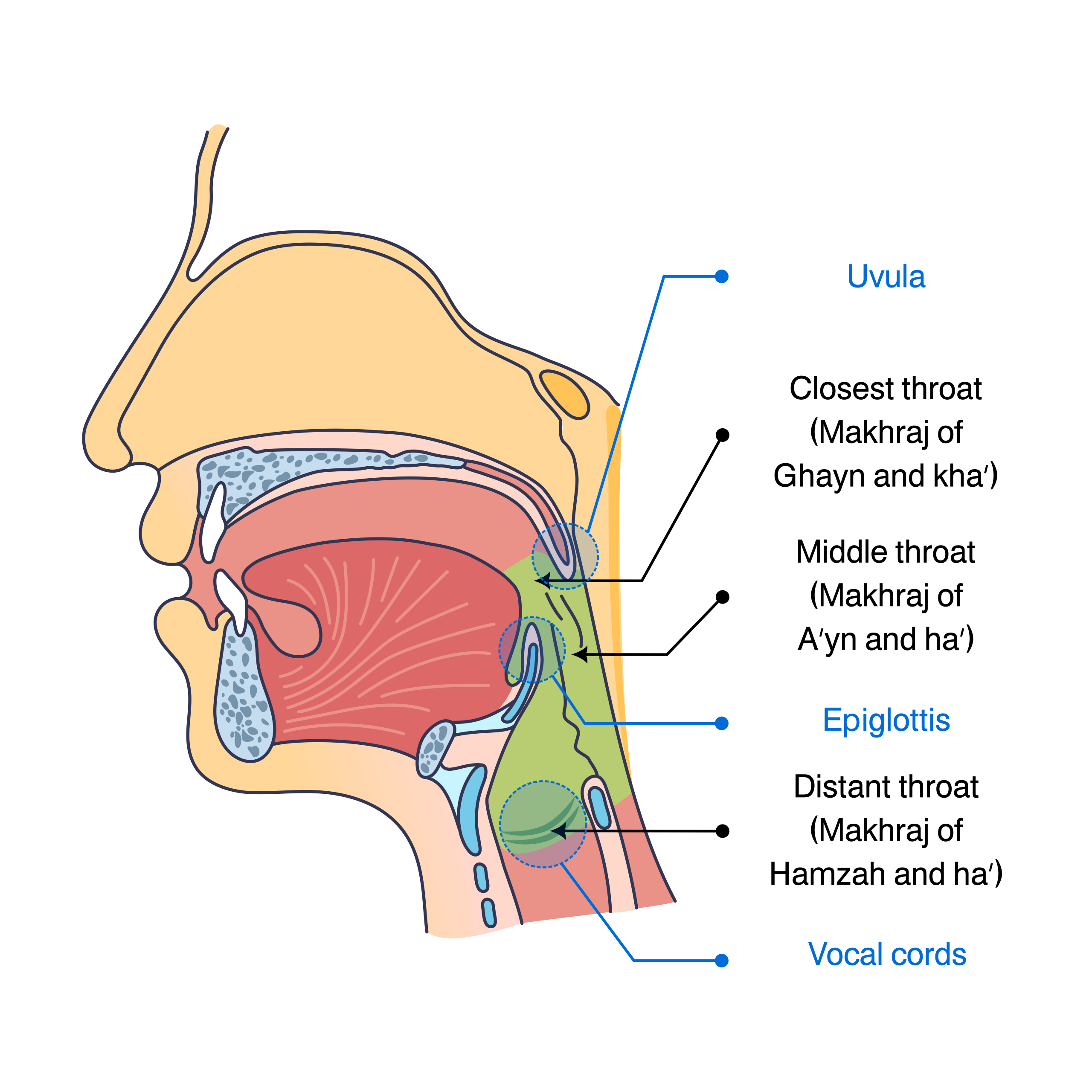 This is the area of the epiglottis (Lisān al-Mizmar). The epiglottis is a flexible cartilaginous tissue located in the middle of the throat. It functions to regulate the passage of air into the trachea and food/water into the esophagus, and it contributes to sound production by widening or narrowing the throat. From this area emerge the letters: ʿAyn (ع) and H’āʼ (ح).